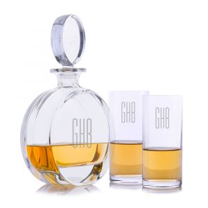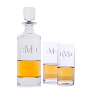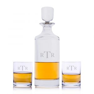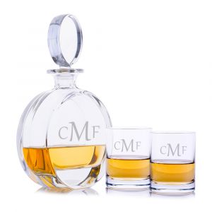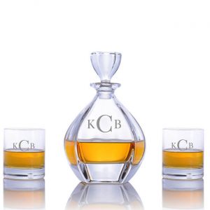 We offer Engraved Whiskey Decanter Sets & Personalized Liquor Decanter Sets. Combine an etched whiskey decanter and engraved Rocks glasses you can create an elegant crystal barware gift. Etched monograms, logos or messages create a one of a kind personalized crystal gift. Present a personalized decanter set on our Beautiful Walnut Wood Tray and you now have created a one of a kind personalized barware gift