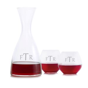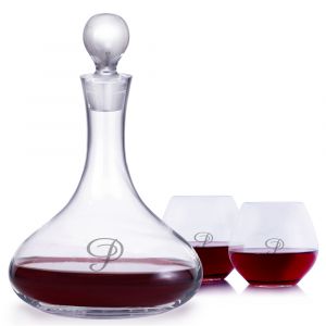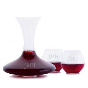 Personalized Wine Decanter Sets or Engraved Wine Carafe Sets are awesome gifts. A monogram on a crystal decanter and glasses is a classic. Add an engraved logo and make a one of a kind set Choose from our quality line of crystal wine decanters and crystal wine glasses. Have a monogram, special message, logo or image engraved to create a beautiful presentation. By adding our Walnut Wood Tray you have now created the ultimate personalized wine decanter gift.